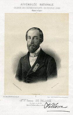 Falloux (Frédéric-Alfred de) (Angers 1811 - 1886), homme politique. Élu député en 1846, puis en 1848. Ministre de l'Instruction publique en 1848-1849, il est à l'origine de la loi établissant la liberté de l'enseignement, votée le 14 janvier 1850 et connue sous le nom de « loi Falloux ». Il se consacre par la suite surtout à l’agriculture, dans son domaine du Bourg-d’Iré et laisse des mémoires, publiés par son neveu Georges de Blois trois ans après sa mort.