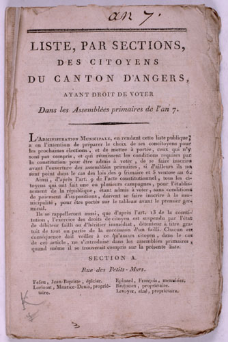 La première grande loi municipale de l'histoire de France, votée le 14 décembre 1789, uniformise les situations acquises au cours des siècles : chaque communauté désormais, ville ou village, forme une commune dirigée par une municipalité élue dont le chef portera le nom de maire. Les électeurs, âgés d'au moins 25 ans, n'étant pas domestiques et payant une contribution correspondant au minimum à un salaire de trois journées de travail, élisent un corps municipal et une assemblée de notables parmi ceux d'entre eux qui payent un impôt équivalent à dix journées de travail. Les villes de 25 000 à 50 000 habitants (Angers compte 30 000 habitants) auront un corps municipal composé de quinze officiers, auquel est adjoint un corps de notables deux fois plus nombreux, réuni - en cas d'affaires importantes - avec le corps municipal pour former le conseil général de la commune.