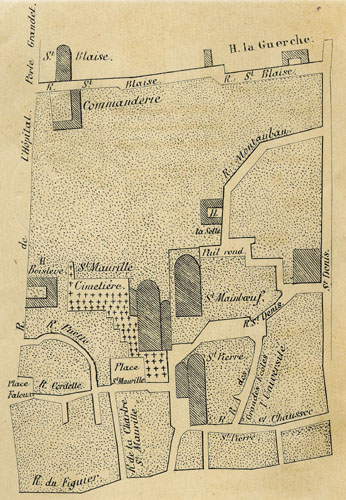 L'historien Blordier-Langlois, né en 1771, s'en souvient, presque avec effroi : "Devant Saint-Maurille (…), était une très petite place circonscrite par l'église paroissiale de Saint-Pierre, et quelques maisons qu'habitaient des chanoines. Des rues étroites conduisaient à cette église ; l'une entre Saint-Pierre et une maison qui forme un angle et qui était si près de Saint-Pierre que les nombreux paroissiens n'y pouvant tenir tous, quelques-uns entendaient l'office assis ou agenouillés sur les marches de cette maison ; l'autre rue étroite qui conduisait à la place Saint-Maurille longeait le cimetière de Saint-Pierre ; une autre enfin est la petite rue Cordelle (…). Tout ce quartier était un vrai dédale, un lieu dont il devait être difficile de se tirer avant l'adoption des réverbères, et dans lequel il était dangereux en tout temps de s'aventurer la nuit".