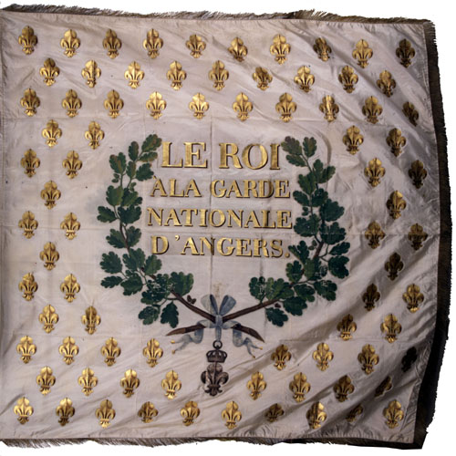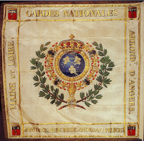 Angers bénéficie alors de la munificence de Louis XVIII, et de son frère (le futur Charles X), qui accordent aux gardes nationaux la faveur d'avoir un drapeau aux armes de France. C'est ce dont témoigne le drapeau conservé aux Archives de la ville, avec ses superbes armes royales peintes à la main. Selon toute probabilité, il s'agit de celui dont le conseil municipal décide l'acquisition le 20 juin 1818 sur le budget de 1819 :