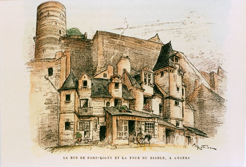 Je n'ai vu dans aucune ville autant de maisons du Moyen Âge qu'à Angers. Plusieurs se distinguent par leurs façades sculptées, où l'on pourrait trouver une foule de renseignemens précieux sur les costumes et les usages des quinzième et seizièmes siècles. La maison qui offre la décoration la plus riche et les sculptures le plus variées forme l'angle d'une rue derrière la cathédrale"
