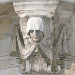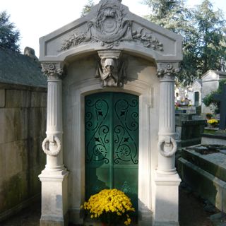 Sa chapelle funéraire présente une très jolie tête de pleureuse, en forme de mascaron, au-dessus de la porte.