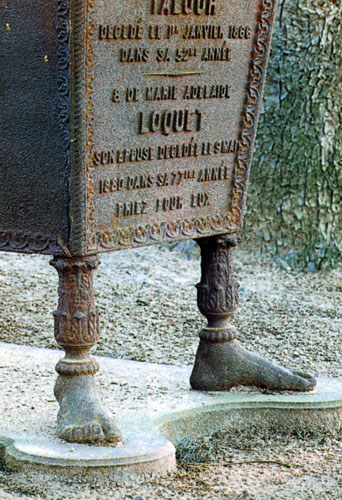- Jean-Baptiste Hyacinthe TALOUR (+1866) et Marie-Adélaïde LOQUET (+1880) son épouse (+1880) : superbe et originale tombe en fonte de fer portée par quatre pieds anthropomorphes. Jean-Baptiste Talour, fils de forgeron, né à La Basse-Indre (Loire-Inférieure), exerçait le métier de fondeur. Son décès est déclaré par Charles Baradez, entrepreneur de fonderie rue de la Tannerie, jusqu'en 1858, frère de Georges qui possédait une usine semblable au Port-de-l'Ancre (quartier Thiers-Boisnet). La tombe sort probablement des fonderies angevines où il travaillait, 19 rue de la Tannerie, dans la Doutre, entreprise qu'il semble avoir dirigée sur la fin de sa vie, en 1865-1866.