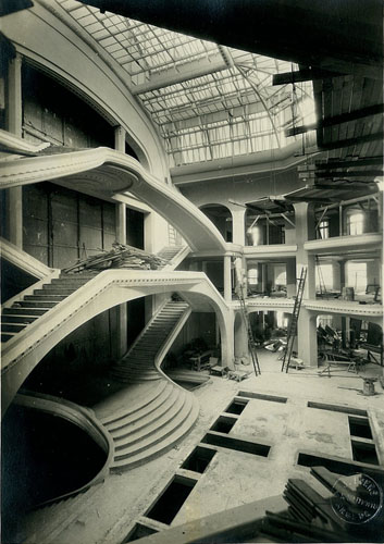 Les travaux débutent par le ravalement des façades du Grand-Hôtel, à l’automne 1926. Le gros oeuvre, réalisé entre janvier 1927 et juin 1928, demande beaucoup de précautions. Le sol, fouillé et refouillé par des générations successives, depuis le cimetière qui s’étendait primitivement à cet endroit, n’offre pas la solidité voulue. Pour dégager l’espace, une poutre en béton armé de 11 mètres de portée doit remplacer les anciennes colonnes de fonte. Une marquise entoure l’intégralité du bâtiment, protégeant les devantures habillées d’un revêtement de marbre.