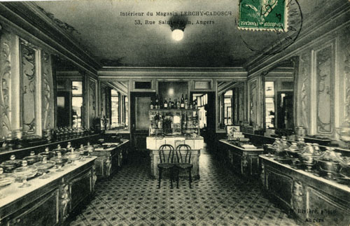 Les locaux sont mis en accord avec l’excellence des produits : achat du numéro 55 en 1894 et aménagement sur la cour de tout un arrière-magasin de deux étages ; achat du 57 en 1903 et construction sur les plans d’Ernest Bricard d’un bel immeuble de style Art nouveau, remplaçant les trois bicoques précédentes. 1903 : c’est l’heure de gloire de la pâtisserie Lerchy-Cadosch, qui possède une succursale à Rennes. Le magasin est désormais délicieusement orné de glaces biseautées, de stucs et de panneaux de faïence. Un grand salon de thé accueille la bourgeoisie angevine. Sucres d’orge, gingembre confit, papillons feuilletés, truffes, biscuits dorés, crackers, bretzels au chocolat, tartes aux fruits, mais aussi « Jeanne-d’Arc » (amandes, nougat et crème), « Vendée et Bretagne » (amandes, génoise et fruits), religieuses, duchesses, vacherins…, il y a de quoi fondre de convoitise !