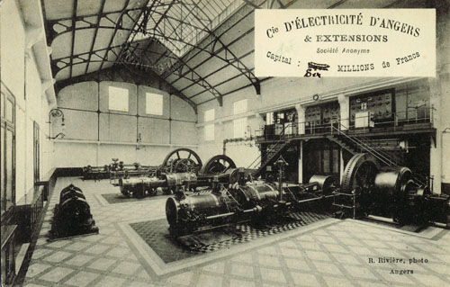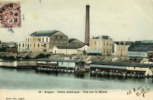 Les statuts de la société anonyme dite Compagnie d’électricité d’Angers et extension sont établis le 14 juin 1899. L’usine électrique, quai Félix-Faure, en amont du pont de la Haute-Chaîne, est achevée fin 1901. Huit chaudières au charbon - consommant l’équivalent d’un train de charbon par jour – produisent la vapeur qui actionne les turbines. Une dynamo transforme le mouvement mécanique en courant continu, réparti par câbles souterrains aux différents points de la ville. Rue Saint-Laud, une sous-station redistribue le courant vers d’autres directions, avec des tensions différentes. L’immeuble du n° 45 porte encore à son fronton l’inscription de la Compagnie d’électricité.