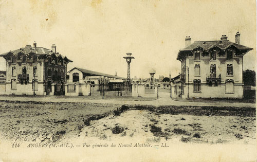 La ville se rapproche avec la construction de l’abattoir, mise au concours en 1830. Jusqu’alors les animaux sont tués en pleine ville, rue de l’Écorcherie (aux environs de l’actuelle rue Plantagenêt)… Après avoir été promené dans différents quartiers, suivant les quatre points cardinaux, de l’Esvière à Saint-Serge et au pâtis Saint-Nicolas, l’abattoir est fixé sur le pré d’Alloyau en 1832, malgré de nombreuses oppositions. On trouve l’emplacement trop proche de la ville. Plusieurs années sont employées à l’énorme remblai nécessaire et à sa stabilisation afin de mettre le terrain hors d’eau en tout temps. Les matériaux sont pris au pâtis Saint-Nicolas. L’adjudication des bâtiments eux-mêmes se déroule le 21 octobre 1841. Les plans ont été dressés par Édouard Moll, architecte choisi pour bâtir le nouvel hôpital. La pose de la première pierre en 1842 est prétexte à une belle cérémonie. Vingt et un livrets de Caisse d’épargne sont délivrés aux ouvriers les plus méritants. L’ouverture n’a lieu que le 20 février 1847. Désormais tous les bouchers sont tenus d’utiliser le nouvel équipement. Le prix d’abattage est fixé à 25 francs pour un bœuf, 10 francs pour une vache, 2 francs pour un mouton…