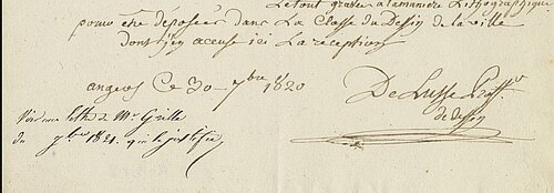 D’un côté Delusse reçoit du maire en novembre 1816 une lettre obligeante lui faisant part de l’appréciation du ministre de l’Intérieur « en faveur de la classe de dessin », dont le professeur remercie l’administration municipale ; de l’autre, le maire Brillet de Villemorge adresse un rapport confidentiel au préfet, indiquant qu’il « pense que M. Delusse n’est pas dans le cas de finir un élève et de le conduire à un certain degré de perfection… » Peu payé, Delusse privilégiait certainement les cours particuliers, d’où les critiques sur son manque d’assiduité à l’école gratuite. Il est remercié en 1829, à l’âge de 71 ans.