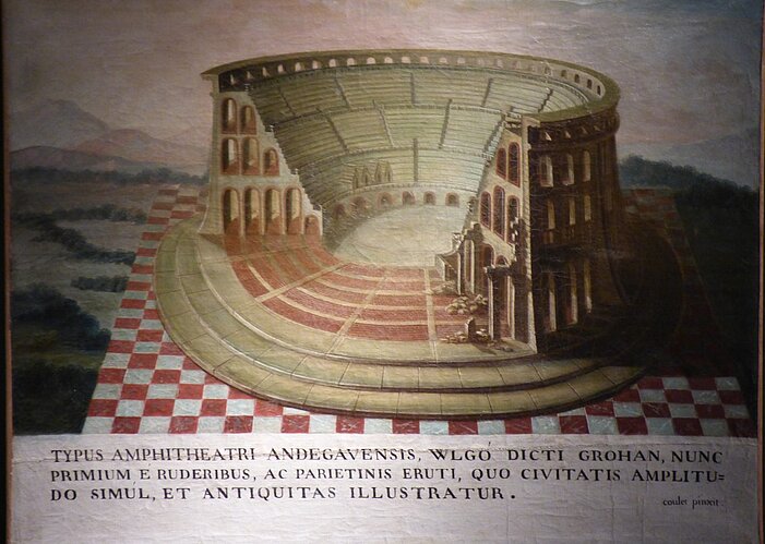 Que devient l’école ? On en est réduit aux conjectures. Claude Coulet n’apparaît plus dans les archives, si ce n’est, un mois avant la décision précédente, qu’il est payé pour le dessin de jetons que la Ville fait frapper (17 juillet 1773). De cet artiste, le musée conserve aussi un tableau représentant une vue imaginaire de l’amphithéâtre d’Angers, dit de Grohan, qui était conservé au collège d’Anjou. Il se peut que l’école subsiste quelque temps. S’est-elle installée au collège d’Anjou ? Un devis de 1798 pour des travaux à exécuter « dans une des salles du ci-devant collège affectée à l’école de dessin » le laisserait croire. À moins que ce document ne fasse allusion au court séjour de l’école centrale en ces lieux. À la veille de la Révolution, l’école de dessin n’existait sans doute plus. En 1787, la municipalité invite en effet les frères des écoles chrétiennes à entretenir un maître de dessin et un particulier, le peintre Bérot, ancien élève de l’Académie royale de peinture de Paris, tient chez lui une école de dessin à partir de juin 1788.