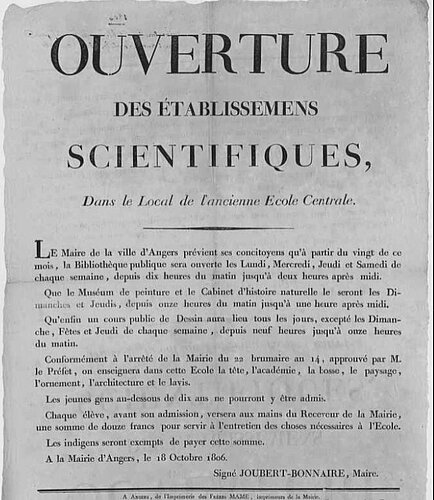 L’école de dessin revit une première fois dans le cadre de la création des écoles centrales. Celle d’Angers ouvre le 20 avril 1796. Elle est fugitivement hébergée au collège d’Anjou jusqu’au 21 novembre 1797, puis gagne le logis Barrault, ancien grand séminaire. Dans son programme d’enseignement, le dessin tient la place d’honneur, en tête de la première section. Il est professé par Joseph Marchand, également chargé du Muséum associé à l’école et qui ouvre en 1801. Les écoles centrales sont supprimées en 1802 pour être remplacées par les lycées. À Angers, l’école poursuit ses cours jusqu’au 4 septembre 1805, laissant au lycée le temps d’ouvrir progressivement les siens à partir de la mi-décembre. Ainsi le hiatus entre les deux enseignements est-il réduit au minimum.