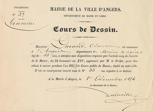 L’apprentissage des beaux-arts se structure sous l’Ancien Régime. L’Académie royale de peinture et de sculpture, fondée à l’initiative de Charles Le Brun en 1648, est reconnue par le roi en 1665. D’autres académies se créent dans le royaume, ainsi à Lyon en 1756. Celle-ci doit former des artistes comme des dessinateurs pour l’industrie de la soie. À Angers, l’initiative vient de deux artistes parisiens, les frères Coulet de Beauregard, qui proposent à la municipalité de créer une académie de dessin, offrant d’y instruire gratuitement le nombre d’enfants pauvres qui leur serait fixé. Après lecture de leur requête, le 17 janvier 1769, trois membres du conseil sont chargés d’apprécier l’avantage que la ville pourrait retirer d’une telle fondation. Au conseil du 27 janvier des précisions sont données sur leur projet : « Ils enseigneront la figure à l’instar de Paris, à dessiner le paysage, les fleurs pour les fabricquants d’indiennes, l’ornement aux orfèvres et autres et les cinq ordres de l’architecture. » Ils se contenteront de trois livres par mois pour chaque écolier. L’assemblée consent à les accueillir et à leur fournir gratis une salle, après qu’elle aura vu les ouvrages dont ils sont capables.
