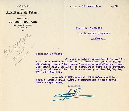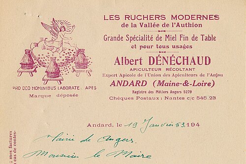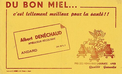 Lors de son discours d’ouverture de la foire aux vins 1926, le docteur Maisonneuve, président de la Fédération des viticulteurs de Maine-et-Loire, n’omet pas de parler d’apiculture… : « Tous les ans, lorsqu’on inaugure la foire aux vins d’Anjou, les portes de la foire au miel s’ouvrent le même jour. » Il souligne que c’est « une industrie un peu nouvelle et un peu jeune », mais qui a déjà pris dans le département une extension considérable. De la « notice de propagande » lancée cette année-là par l’Union des apiculteurs, il retient d’ailleurs une phrase significative, qui lui plaît beaucoup, dit-il, car elle montre la grande utilité du miel : « Pour entretenir la santé, il faut deux choses : se nourrir quand on est bien portant et se guérir quand on est malade. Dans le miel, nous trouvons ces deux éléments ; la nourriture et le remède. Un kilo de miel vaut 3,5 kg de viande ou 12 kg de légumes verts. »