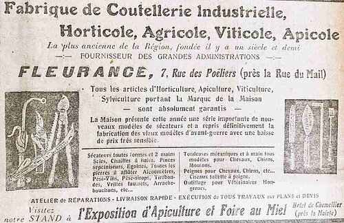 La deuxième foire au miel, en novembre 1922, se tient de nouveau salle Chemellier, dont elle remplit cette fois tout le rez-de-chaussée et une partie des galeries du premier étage. C’est que les apiculteurs y exposent aussi différents modèles de ruches, des rayons de miel tels qu’ils sont dans les ruches et leurs instruments de travail. Un concours apicole – le premier en Anjou – accompagne la manifestation, subventionnée par le ministère de l’Agriculture. Les élèves des écoles qui ont reçu des leçons d’apiculture peuvent y participer. Les catégories de prix sont nombreuses : miel, cire, cirage et lait de cire, propolis, hydromel, oenomel (boisson fermentée au miel), liqueurs, vinaigre de miel, pâtisseries, confitures au miel… et tous les instruments apicoles. Des nouveautés sont présentées par leurs inventeurs. Le melloscope – pour mesurer la couleur des miels – du directeur du rucher d’Ornay à Châtillon-sur-Indre reçoit le premier prix. Le deuxième va à la coutellerie Loret-Fleurance (rue des Poêliers, magasin toujours existant) pour un couteau de poche. Le stand Fleurance est particulièrement riche en matériel.
