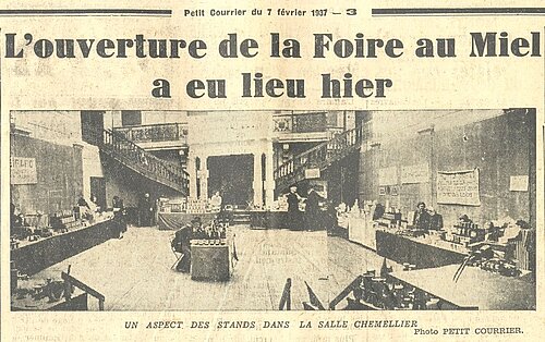 La première foire est inaugurée ce jour-là salle Chemellier, près de l’hôtel de ville, par les plus hautes personnalités d’Angers : le préfet Emmanuel Borromée, le maire de la ville Victor Bernier, ses adjoints Planchenault et Pottier, l’industriel vinaigrier et conseiller municipal Durbecé. Le bureau de l’Union des apiculteurs au grand complet fait les honneurs de la huitaine de stands : l’abbé Rousselot, curé de Sorges, président ; la comtesse de Lozé et Eugène Proust, vice-présidents ; Verdon-Richard, secrétaire général et Cochin, trésorier. Deux types de produits sont présentés : ceux qui sont récoltés et élaborés par les abeilles, miel, pollen, cire et ceux qui sont fabriqués par les apiculteurs eux-mêmes : gâteaux, pains d’épices, bonbons, hydromel, liqueurs au miel. Le compte rendu de l’inauguration note particulièrement « un miel au chocolat, possédant les propriétés adoucissantes et rafraîchissantes qui en font un aliment aussi agréable que délicat ».