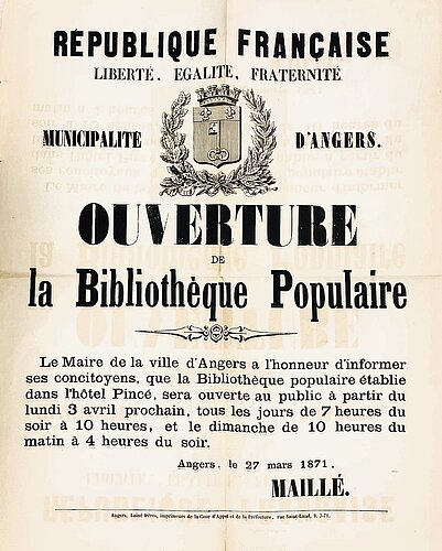 Quoique bien tracé, le chemin de la bibliothèque populaire du soir et du dimanche s’arrête dès 1874 à l’expiration du bail du Palais des marchands. Les bâtiments sont repris par Rémy Chanlouineau pour accueillir, sous cette enseigne de Palais des Marchands, le célèbre grand magasin angevin. Fort heureusement, le programme de la municipalité Maillé, élue en 1870, avait pour axe principal le développement de l’instruction publique. En plus de la création d’écoles communales, elle veut favoriser la lecture publique. Faute de pouvoir organiser – à cause du danger présenté par l’éclairage - des séances du soir à la grande bibliothèque du logis Barrault, elle décide en janvier 1871 de créer deux bibliothèques populaires, l’une rive gauche et l’autre rive droite.