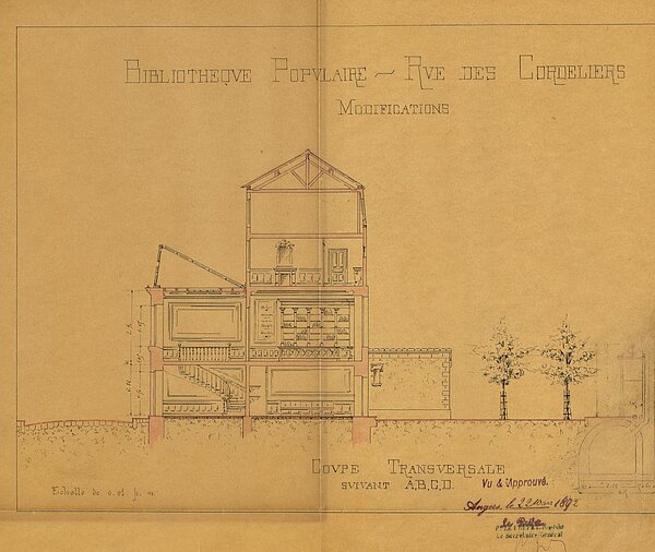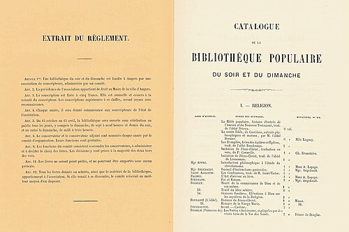 Pour développer la lecture publique, il fallait multiplier les salles de lecture et pouvoir prêter les livres. Alors qu’en 1860 le gouvernement prenait des mesures incitatives pour créer dans chaque école une bibliothèque, les initiatives privées se développent. La première bibliothèque populaire ouvre à Angers en 1865 grâce à l’une de ces initiatives. Elle s’installe au Palais des marchands, rue Baudrière, où se tenait, sous l’Ancien Régime, la juridiction consulaire. C’est une association de souscripteurs qui la crée. Son comité, présidé par le maire d’Angers, se compose de vingt-trois membres. Autour de lui figurent des personnalités parmi les plus connues de la bourgeoisie angevine : avocats, magistrats, professeurs, hommes politiques, industriels… Ce sont par exemple Biéchy, professeur de philosophie au lycée ; J. Cesbron-Lavau, maire de Faveraye ; Ambroise Joubert, manufacturier ; Parage-Farran, conseiller général et municipal ; Eugène Poitou, conseiller à la cour impériale ; J. Sorin, inspecteur honoraire d’Académie ; Segris, député au Corps législatif…
