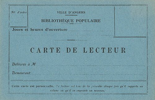 Un système plus libéral est adopté en 1878. La municipalité se rend compte qu’il n’y a de véritablement populaire, et donc de véritablement utile que les bibliothèques qui ont organisé le prêt des livres au dehors (délibération du conseil municipal, 13 mars 1878). En effet, malgré un fonds de livres qui a été porté à quelque 3 000 volumes par l’achat d’une partie des ouvrages de la bibliothèque du Palais des marchands en 1874, il n’y a guère que vingt lecteurs par soirée. Le conseil décide de maintenir l’ouverture de la salle le soir, mais autorise le prêt. C’est sur ce pied, et après des travaux d’agrandissement, que le service rouvre le 21 juillet 1878. Un nouveau règlement est édicté, corrigé en 1883. Il s’est largement inspiré de celui de la bibliothèque populaire Anne-de-Graville, au Havre, de 1874. La gratuité est toujours de mise. Toute personne domiciliée à Angers et âgée de 15 au moins peut emprunter. Une carte nominative est établie. On ne peut emprunter que deux volumes à la fois et pour un mois. En cas de non restitution, le lecteur devra payer une indemnité.