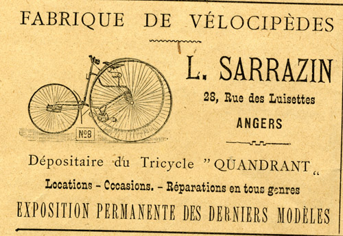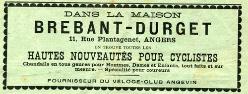 Quoi d’étonnant à ce que l’Anjou ait produit de nombreux champions, Angevins d’origine ou d’adoption, bien oubliés aujourd’hui, tels Louis Cottereau, Ferdinand Charron, Georges Laulan, Henri Béconnais… Quoi d’étonnant aussi à ce que l’industrie cycliste ait été si florissante à Angers dès les années 1880, avec Quenion, Rivain, Gaultier, Brice, Malinge, Goujon… ? N’est-ce pas d’ailleurs l’Angevin Pierre Giffard qui a donné à la bicyclette son surnom de « petite reine » en 1891 ?