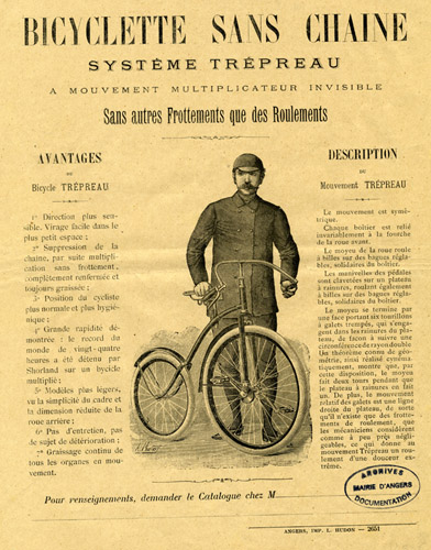 Angers est, avec Bordeaux et Grenoble, l’un des berceaux du cyclisme. Bertrand Soux, chef d’atelier de l’école des arts et métiers, construit en 1869 un vélocipède dont il se sert le dimanche. Son bicycle - aujourd’hui conservé au musée d’Angers – est à roues inégales en bois, cerclées d’une bande de fer. C’est le premier constructeur de cycles à Angers, avant Henri Trépreau (1892) et Potelune (1893). En novembre 1868, la première course de vélocipèdes se déroule lors des courses hippiques d'automne (1). Le 22 avril 1869, l’intrépide cavalier Jacques de Vezins, Paul de Chemellier et Baillergeau organisent une deuxième courses cycliste, toujours sur le modèle des courses de chevaux, au rond-point des Magnolias, actuelle place André-Leroy. Les concurrents n’ont pas de dossards, mais des casaques de couleur. Pour la quatrième course (gentlemen), la tenue de jockey est de rigueur.