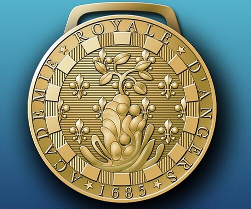 Les lettres patentes sont octroyées en juin 1685, enregistrées au Parlement le 7 septembre suivant et seulement le 15 juin 1686 par le présidial d’Angers. Était-il jaloux du succès de la municipalité ? Beaucoup de ses membres pourtant appartenaient au corps de ville. Les statuts et privilèges accordés à l’académie royale d’Angers s’inspirent de ceux de l’Académie française fondée en 1635 : mêmes honneurs, franchises et libertés, mais ses membres n’obtiennent pas le privilège de committimus - ils seront, s’il y a lieu, jugés devant les juridictions ordinaires - et leur nombre est limité à trente. Six membres honoraires y ont en outre place de droit : l’évêque d’Angers, le lieutenant de roi pour la ville et le château, le premier président du présidial et son lieutenant général, le maire et le procureur du roi. Le sceau adopté est illustré d’un Parnasse d’or surmonté d’un laurier de même. Quant à la devise, illustrée par une fontaine en forme de vase, « Maculas ostendit et aufert », c’est une belle allégorie que l’on peut traduire littéralement par « elle fait voir les taches et les supprime », ou plus joliment par la formule « elle éclaire l’esprit ».