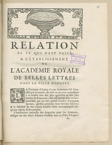 Le 4 juillet 1686, l’évêque d’Angers, Mgr Arnauld, est élu directeur de la nouvelle académie.