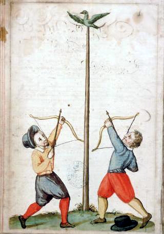 Les compagnies d’archers et d’arbalétriers apparaissent aux XIe-XIIe siècles dans les « bonnes villes » du nord de la France et connaissent un grand essor lors des troubles de la guerre de Cent ans. Il en va de la défense des villes et c’est aussi un « honnête » divertissement qui éloigne de la « débauche »... Nantes obtient un jeu de papegaut en 1407. Il est formalisé à Rennes en 1443, mais semble remonter au XIVe siècle, Du Guesclin ayant remporté dans sa jeunesse le prix du papegaut et de la lance au champ Jacquet.