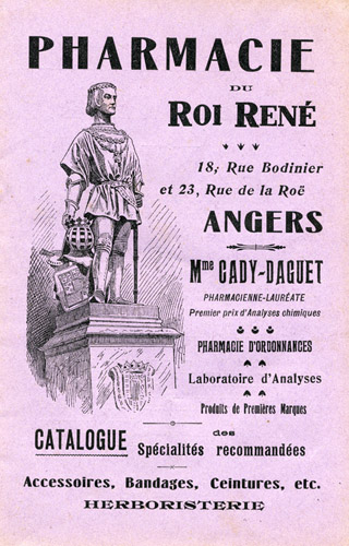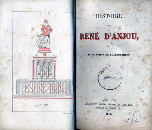 « Au roi René, avec le produit de ses œuvres, par le comte de Quatrebarbes ». « La statue est posée, avec raison, conclut l’article du Journal de Maine-et-Loire du 2 juin 1853, en face du boulevard des Lices. Lorsqu’on la contemple de la chaussée, elle se détache admirablement sur une vaste étendue de ciel ; vue de côté, elle semble sortir fièrement du château formidable qui fut le berceau de René d’Anjou. Quel que soit du reste le point choisi par le spectateur, elle est pleine de vie et de mouvement, il semble qu’on la voit marcher. […] Notre roi René restera comme l’une des belles inspirations de notre illustre statuaire ; on lui a demandé une figure jeune, vaillante et artiste. Il nous semble difficile de réaliser plus noblement les trois conditions. »