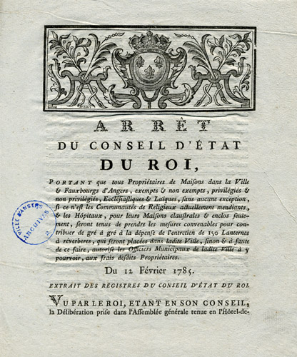Quand les Angevins ont enfin acquitté cette taxe, la municipalité obtient un arrêt du roi du 8 mars 1704 lui permettant d’employer à d’autres dépenses - pendant quatre, puis cinq ans - la somme destinée à l’éclairage. Mais les lanternes, éteintes en mars 1704, ne sont pas rallumées…
