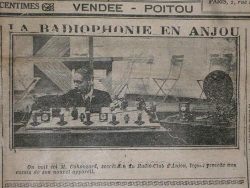 L’un des premiers articles que la presse angevine consacre à la TSF paraît dans L’Ouest du 23 octobre 1912 : « La télégraphie sans fil à Angers. Un particulier a établi chez lui un poste de TSF et reçoit régulièrement un grand nombre de radiotélégrammes ». L’installation est rudimentaire : « Au mur, une planchette, ornée en son milieu d’une espèce de bobine grosse comme une bouteille. Au-dessus et au-dessous, deux petites boîtes en bois – de celles où d’ordinaire se rangent les dominos – et surmontant le tout, un petit pot de verre frère jumeau, sans doute, des moutardiers de Dijon. À côté, sur une tablette, une petite cage de verre abritant une espèce de très petite balance… » Et c’était là tout. Le sans-filiste, coiffé d’un casque téléphonique relié à la planchette par un fil souple, doit connaître le morse pour déchiffrer les télégrammes et nouvelles de la journée envoyés par la tour Eiffel aux postes côtiers et aux amateurs. Il doit lire « au son », sans avoir besoin de voir points et traits pour comprendre la lettre, comme les télégraphistes.