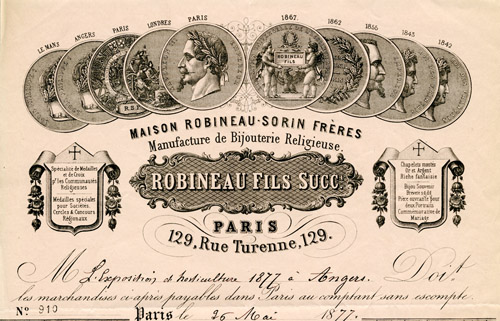 L’habitude de remettre des médailles prend sa source véritable dans les années 1830, avec l’organisation des premières expositions. C’est d’abord la Société d’agriculture, sciences et arts, héritière de l’Académie royale, qui fait confectionner en 1832 un coin à médailles, pour récompenser les lauréats de ses expositions d’horticulture. À partir de 1835, l’organisation régulière d’expositions agricoles, industrielles et artistiques, patronnées par la Société industrielle, est soutenue par la Ville. Trente-deux médailles sont offertes en 1858. Éditées par la Monnaie de Paris, elles sont gravées au nom du récipiendaire, par l’Angevin Charle, rue des Lices. En effet, suivant l’arrêté du 5 germinal an XII (26 mars 1804), toute médaille devait alors être frappée dans l’atelier de l’État, à l’hôtel des Monnaies, après autorisation dûment accordée par le ministère de l’Intérieur. La Ville traite avec la Monnaie de Paris, soit directement, soit par l’intermédiaire d’un fabricant de médailles, comme la maison Robineau-Sorin Frères, à Paris, comme en 1877, où elle se procure soixante-dix-huit médailles pour l’exposition de cette année-là.