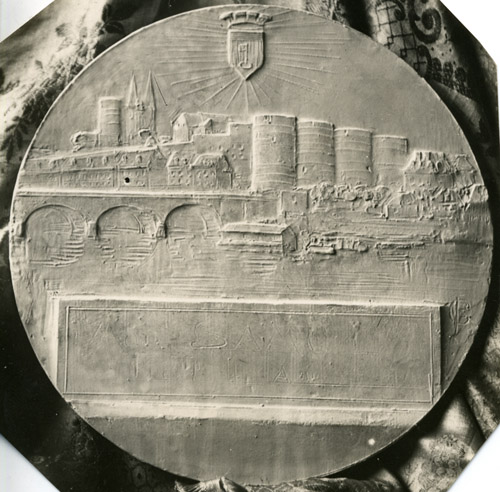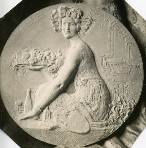 Un autre fournisseur figure dans les archives, le sculpteur angevin René Grégoire (1871-1945), Grand Prix de Rome en 1899. Le conseil municipal l’a nommé « conseiller technique pour les beaux-arts et pour l’embellissement de la ville » en 1919. À ce titre, il est l’auteur en 1932 d’une nouvelle médaille de la Ville d’Angers. Les documents concernant la commande et la réalisation n’ont pas été retrouvés. Mais un échange de correspondance entre 1944 et 1950 livre de précieuses photographies. Le 3 février 1945, le maire demande à l’artiste s’il est toujours en mesure de fournir des médailles « Tête de ville », module 50 mm et indique : « Je vous joins à toutes fins utiles une photographie de cette médaille ». Au lieu d’un seul cliché, le dossier en contient quatre, trois modèles différents pour l’avers, un seul pour le revers. Il s’agit de maquettes en plâtre ou terre cuite, projets répondants à une commande spéciale sans doute passée pour renouveler la traditionnelle médaille d’Henri Dubois. Le sculpteur y décline le thème de l’Angevine, présentant les richesses de sa région, thème qu’il a déjà utilisé pour la médaille rectangulaire spéciale – une plaquette – de la 49e fête fédérale de gymnastique de 1927, portant sur l’avers une Angevine en coiffe assise sur fond de ville.