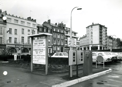 Mais la zone bleue n’est efficace qu’au prix d’une surveillance permanente très onéreuse. Après avoir abandonné au stationnement la moindre place, la Ville songe à créer un parking payant pour éviter l’asphyxie du centre. On pense l’établir en 1965 en contrebas de la place Mondain-Chanlouineau (emplacement actuel de Fleur d’Eau). Finalement, c’est dans la cour de la gare que le premier parking payant d’Angers voit le jour fin 1966, avec 70 places environ. L’usager paye auprès d’un monnayeur fourni par la Société anonyme française des appareils automatiques, qui a équipé les parkings des aéroports d’Orly, du Bourget et de Nice. La redevance est fixée à 3 francs pour 48 heures de stationnement. Le tarif est le même pour 24, 48 ou 72 heures ! C’est que le monnayeur n’est pas encore très perfectionné… Les débuts ne sont pas parfaits. L’appareil ne rend parfois que deux pièces sur trois. Certains usagers utilisent de fausses pièces. Mais le système se rode et donne rapidement satisfaction. Le parking est amorti en l’espace de trois ans.
