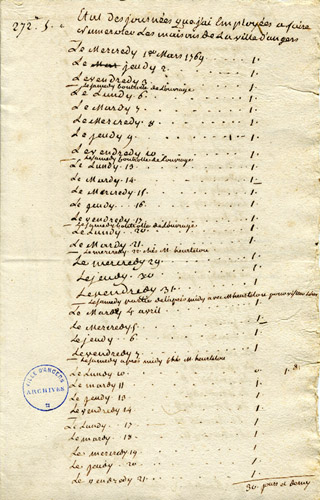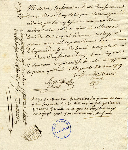 Pour cette opération, les échevins s’adressent au sieur Mussault, cavalier de la brigade de la maréchaussée et au sergent Portier, servant au bureau de la capitation de la ville. L’affaire est rondement menée, entre le 1er mars et le 11 juillet 1769, contrôlée tous les samedis par Heurtelou, receveur de la ville. Leurs 60,5 journées de travail sont rétribuées respectivement 272 livres 5 sols et 151 livres 5 sols. Le sieur Gouamier, chargé d’apposer l’empreinte du numéro sur chaque maison, en couleur rouge à l’huile, utilise 60 livres d’ocre (près de 30 kg) et 35 pintes d’huile (plus de 33 litres). Son mémoire se monte à 128 livres. L’un de ces numéros, le 592, est encore visible aujourd’hui sur l’hôtel de Senonnes, rue David-d’Angers.