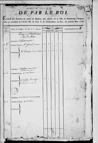Louis XV veut y porter remède par l’ordonnance du 1er mars 1768 réglant le service des places du royaume. L’un des articles prescrit de numéroter les maisons pour faciliter le logement des gens de guerre. L’intendant la communique au maire d’Angers par lettre du 27 mai et le 22 février 1769, le conseil municipal décide de faire numéroter « toutes les maisons sans réserve, tant de la ville que des fauxbourgs et environs incessament ».