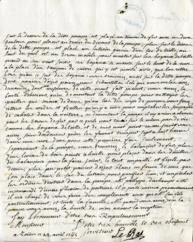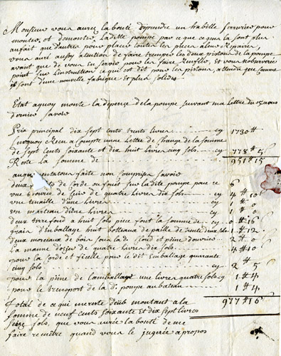 « Messieurs, vous aurez la bonté de prendre un habile serrurier pour monter et démonter ladite pompe, parce que ces gens-là sont plus au fait que d’autres pour placer touttes les pièces à leurs repaires. Vous aurez aussi attention de faire tremper les deux pistons de la pompe avant que de vous en servir pour les faire remfler et vous n’observerez point sur l’instruction ce qu’il est dit pour les pistons, atendu que comme ils sont d’une nouvelle fabrique et plus solides […] » (Archives municipales, CC 22 et BB 113, f° 112-113).