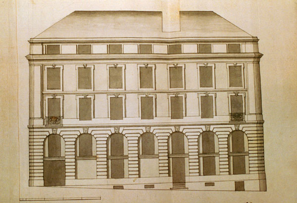 L'élévation est divisée en quatre niveaux. Le rez-de-chaussée, formant boutique et entresol, est rythmé par une série d'arcades en pelin-cintre. Cette base est soulignée par une corniche à forte saillie. Deux étages nobles, à hautes fenêtres à linteaux, sont séparés par une plate-bande, mais reliés aux extrémités par des pilastres sans chapiteaux. Au-dessus d'une corniche volumineuse, se trouvent l'attique et le toit, à double rampant de faible pente.