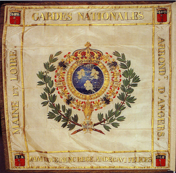 La garde nationale, milice bourgeoise formée de volontaires chargés de veiller à la sécurité d'une ville, créée en juillet 1789 à Paris, puis dans les villes de province, survit aux changements de régime du XIXe siècle. Sous la Restauration, celle d'Angers est régulièrement citée dans les almanachs du département. C'est en 1818 que la municipalité vote un crédit de 400 francs pour l'acquisition d'un drapeau aux armes de France, faveur accordée par Louis XVIII et le futur Charles X.