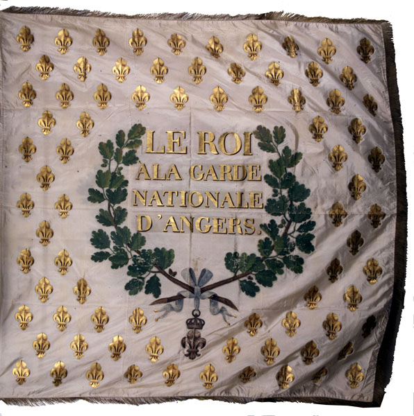 Acheté en vente publique en décembre 1990, ce drapeau de la garde nationale d'Angers est en soie peinte, dans un état de conservation exceptionnel. Bordé sur trois côtés de franges d'or, il présente sur la face principale les armes de France entourées des colliers de saint Michel et du Saint-Esprit et par deux branches de chêne. Aux quatre angles sont placées les armes de la ville d'Angers, séparées par les inscriptions : Maine-et-Loire - gardes nationales - arrondissement d'Angers. Jam duce nunc rege Andecavi felices. Cette dernière inscription, que l'on peut traduire par "naguère heureux de l'avoir pour duc, les Angevins sont aujourd'hui heureux de l'avoir pour roi", évoque les années 1771 à 1790, lorsque Monsieur, frère de Louis XVI et futur Louis XVIII, était duc apanagé d'Anjou. Au verso, un semis de fleurs de lis et de feuilles de chêne environne l'inscription le roi à la garde nationale.