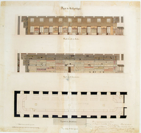 La bibliothèque municipale est une création de la Révolution. A l'origine bibliothèque de l'École centrale, elle est inaugurée dans l'ancien évêché en 1798. Le premier noyau des collections est formé par les ouvrages confisqués aux communautés religieuses et aux émigrés. Après l'arrivée de l'évêque concordataire, Mgr Montault, en juin 1802, la bibliothèque est transférée au logis Barrault (1804). Son installation reste provisoire, en attendant l'aménagement de nouveaux locaux. Tout y est fort mal commode : la salle de lecture est placée au-dessus de la chapelle Saint-Éloi, desservie par l'arcade qui enjambe la rue du Musée. Les livres sont entassés dans des greniers et des cabinets étroits. Ce provisoire va durer quarante-quatre ans.