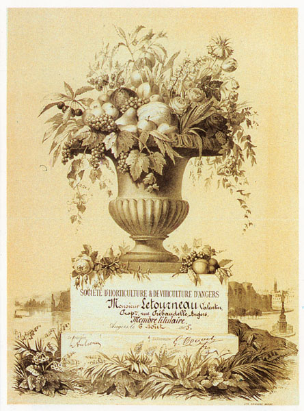 Le 2 janvier 1864, le Comice est érigé en Société d'Horticulture à part entière. Le pépiniériste André Leroy en est nommé président, mais, à la suite d'incidents, il démissionne. Drouard lui succède, puis en 1878 M. de La Devansaye, propriétaire du château du Fresne à Auverse, collectionneur de plantes rares, connu pour ses collections d'orchidées et de palmiers. Sa fille a fait don à la Société d'Horticulture de son importante bibliothèque horticole. Louis-Anatole Leroy, pépiniériste au Grand-Jardin (près de l'avenue Pasteur), adjoint au maire d'Angers et conseiller général, lui succède de 1901 à 1920. Sous sa direction ont lieu le congrès des Chrysanthémistes et celui des Roses. On trouve sa signature, ainsi que celle du secrétaire de la Société, Georges Bouvet, directeur du jardin des Plantes, sur ce diplôme illustré que chaque nouveau membre de la Société recevait. Valentin Letourneau, admis en 1905, était chef du bureau du Bien public, l'un des plus importants de la Mairie, depuis 1895.