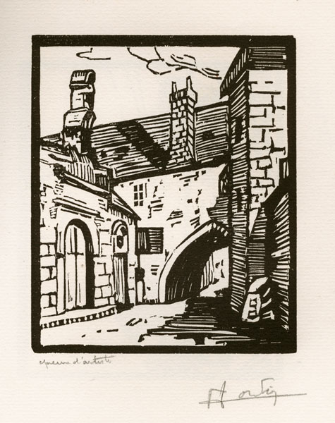 Bois gravé d'Henri Cordier : le passage de la Censerie à Angers, 1929. Bois de fil, 12 x 10, épaisseur 2,2 cm. Arch. mun. Angers, 1 J 122.